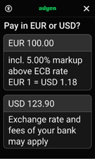 - If the guest's billing currency differs from the local currency, the terminal prompts the guest to choose between paying in the local currency or their own billing currency.