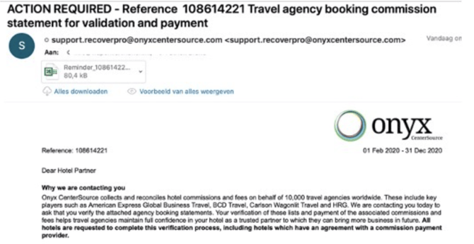 We regularly receive queries from hotels about e-mails they receive from Onyx CenterSource, the system in which Travel Agent commission payments are handled. Monthly, these statements are automatically sent to hotels.